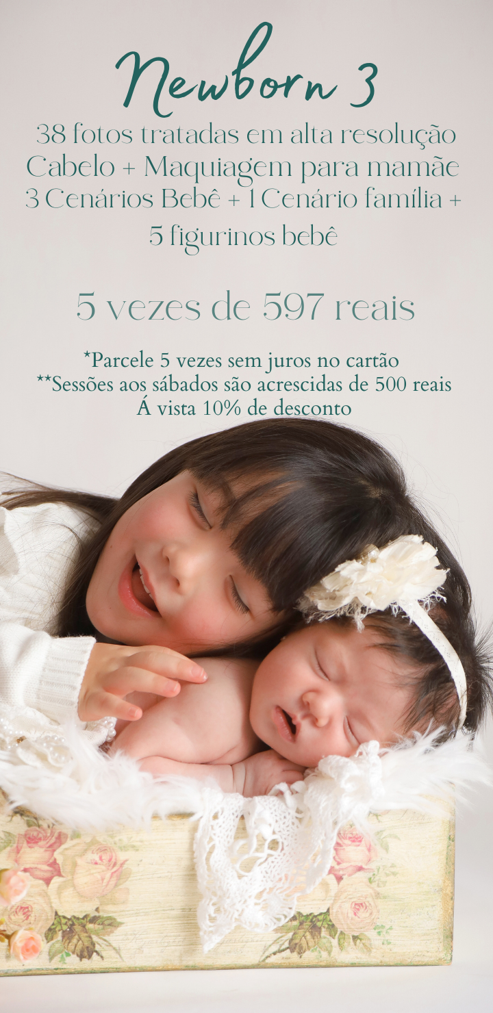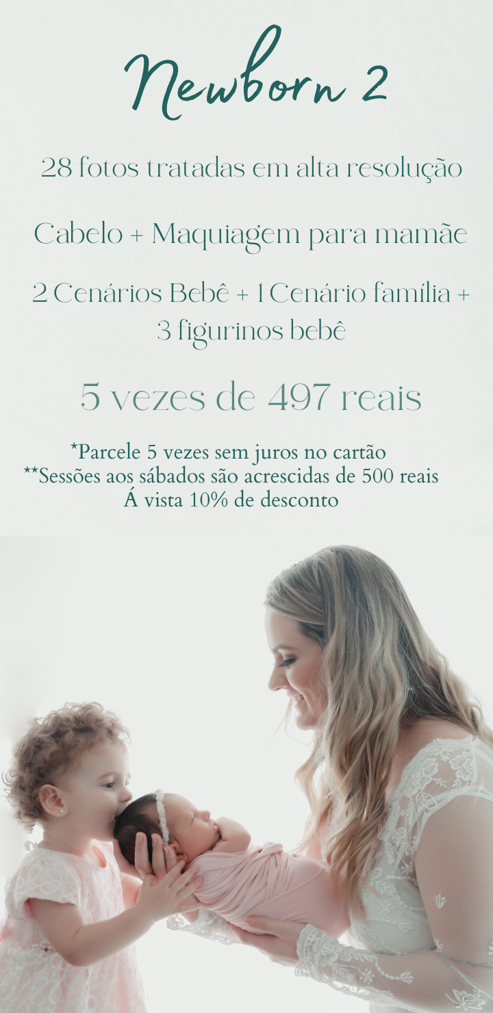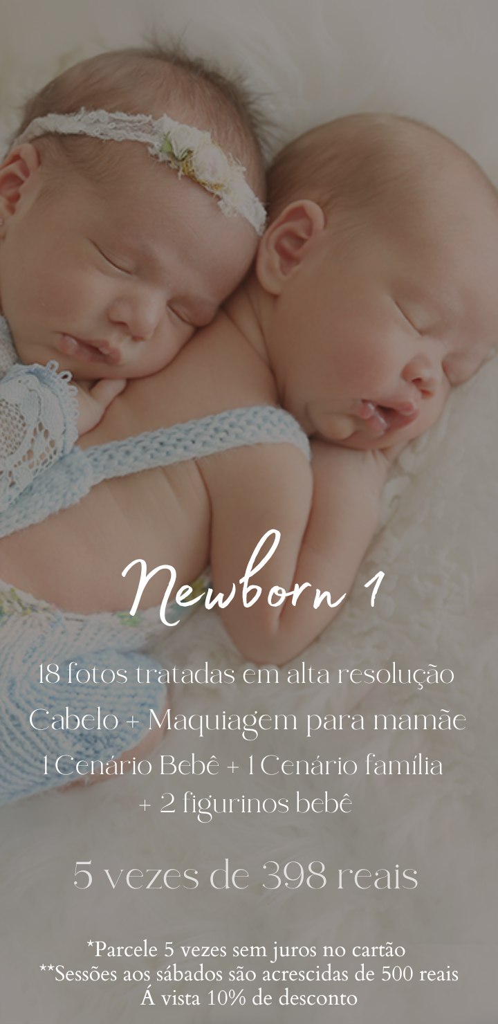 Os valores do ensaio newborn começam a partir de 1990 reais e incluem produção completa para a mãe com cabelo, Maquiagem e Figurinos, além de roupinhas e cenários personalizados para o bebê.